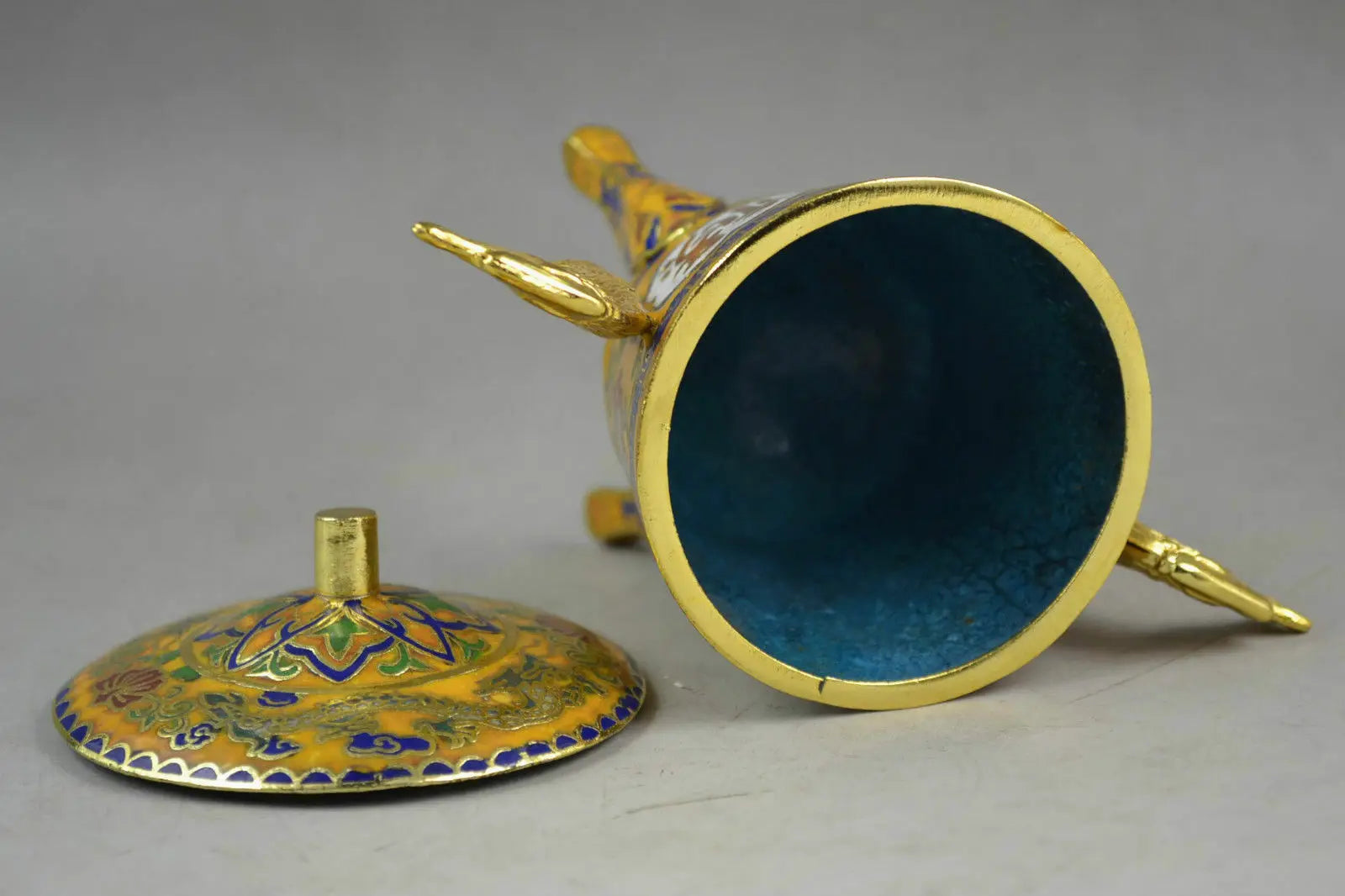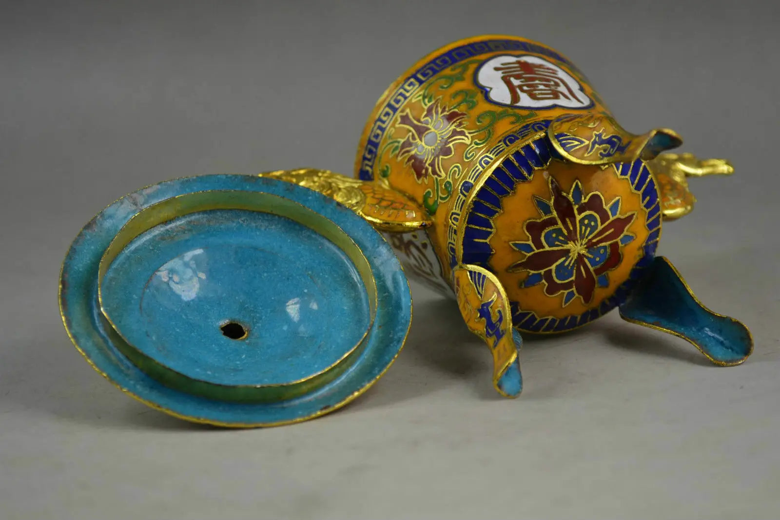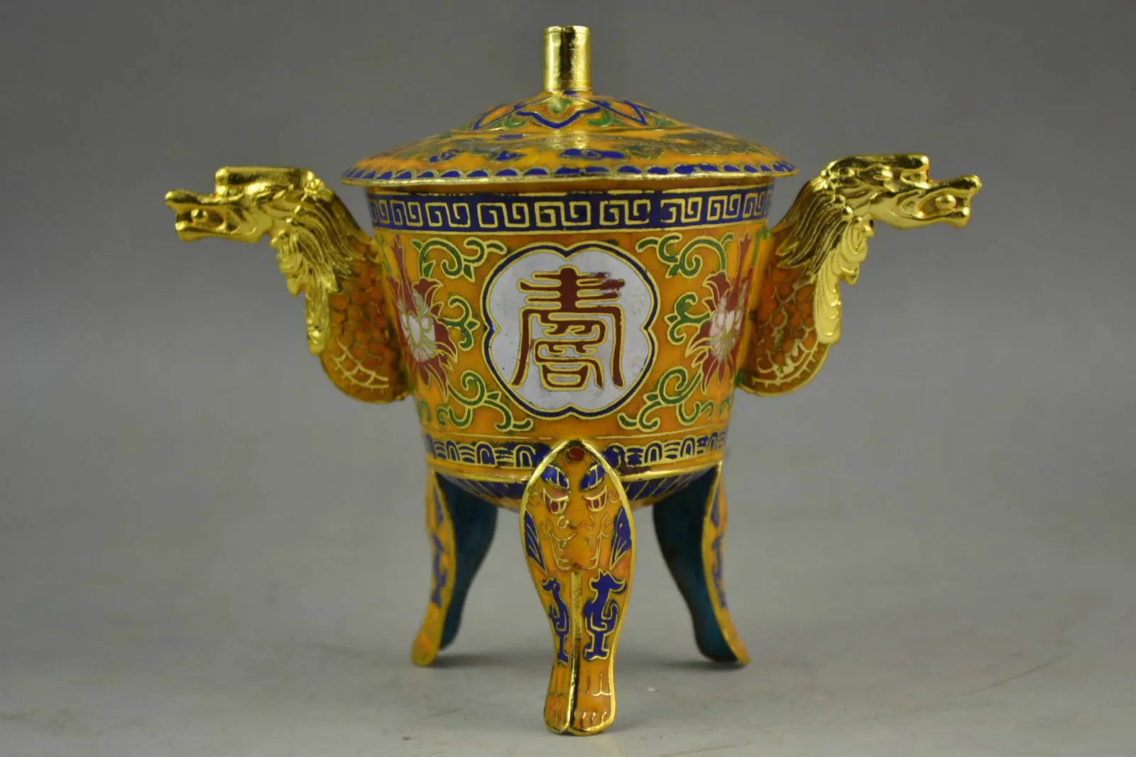 Chinese Handwork Closionne Carving Lifelike Flower & 2 Dragon Incense burner