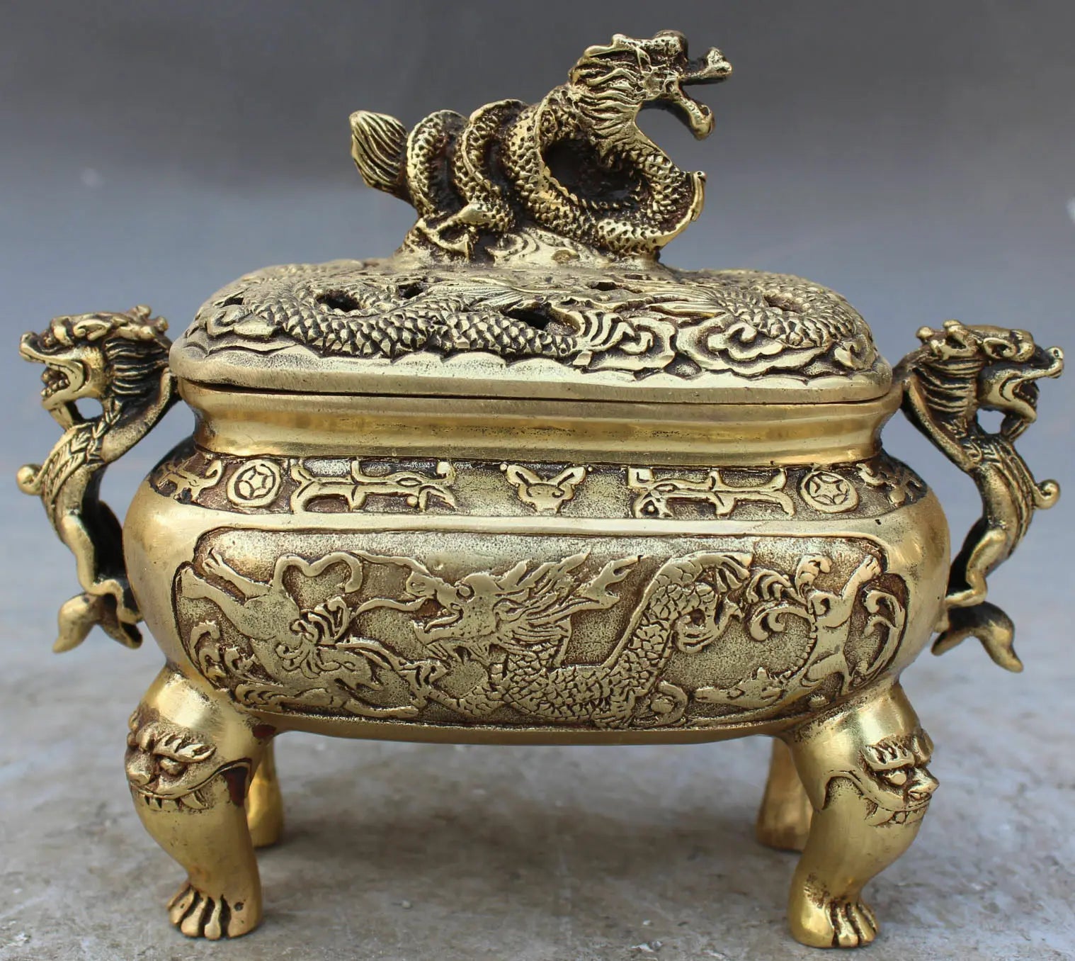 Marked Chinese Old Bronze Dragon Dragons Foo Fu Dog Lion Incense Burner Censer